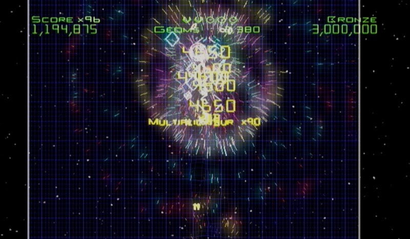 Graphiquement, le jeu est très propre avec de belles originalités. Les phases de tir sont sur fond spatial, simple, et on se trouve toujours dans un environnement fermé par des murs que l’on ne peut dépasser. Les ennemis sont pour la plupart composés de formes géométriques simples (croix, carré, losange, triangle, rond, ligne, …) et de couleurs flashy pour les reconnaître facilement. Chaque forme a une capacité qu’il faut bien appréhender pour survivre. Certains par exemple deviennent de petits trous noirs lorsqu’ils sont détruits attirant autant les ennemis que vous, d’autres vous suivront à la trace, d’autres encore feront tout pour éviter vos tirs et vous surprendre dans votre dos, il y en a qui se multiplient à chaque tir, d’autres encore qui laissent une trainée lumineuse dangereuse, … Je ne vais pas passer tout en revue pour ne pas gâcher votre plaisir mais il y a de la matière. Aussi, votre petit vaisseau, en fait ses tirs, peuvent évoluer pour devenir de plus en plus puissants au point de déformer visuellement l’espace de jeu à chaque tir. C’est très beau, on a toujours l’impression de voir un feu d’artifice à l’écran et c’est vraiment survolté, surtout que le jeu est agrémenté de pistes sonores très rythmées, genre électro, qui vous mettent encore plus dans cette ambiance de folie furieuse. Banzaaaaiiii.